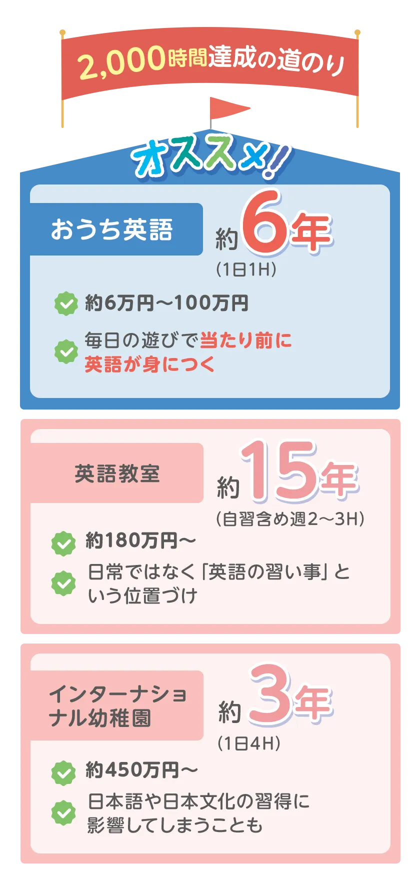 日常会話レベルの英語習得には 約2,000時間のインプットが必要と言われますが、年齢や接触頻度によって期間や費用、労力に大きな差が出ます。
