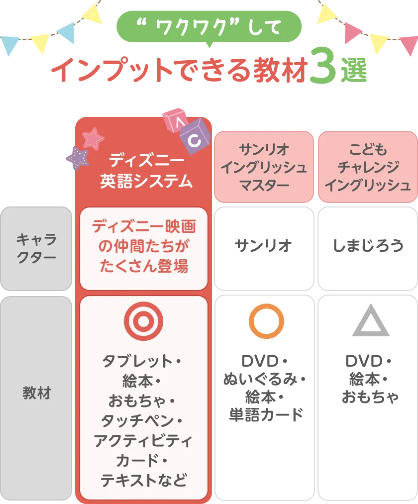 • 語学・幼児教育の専門家が監修した内容で、DVD・絵本・玩具と多角的な教材でアプローチ